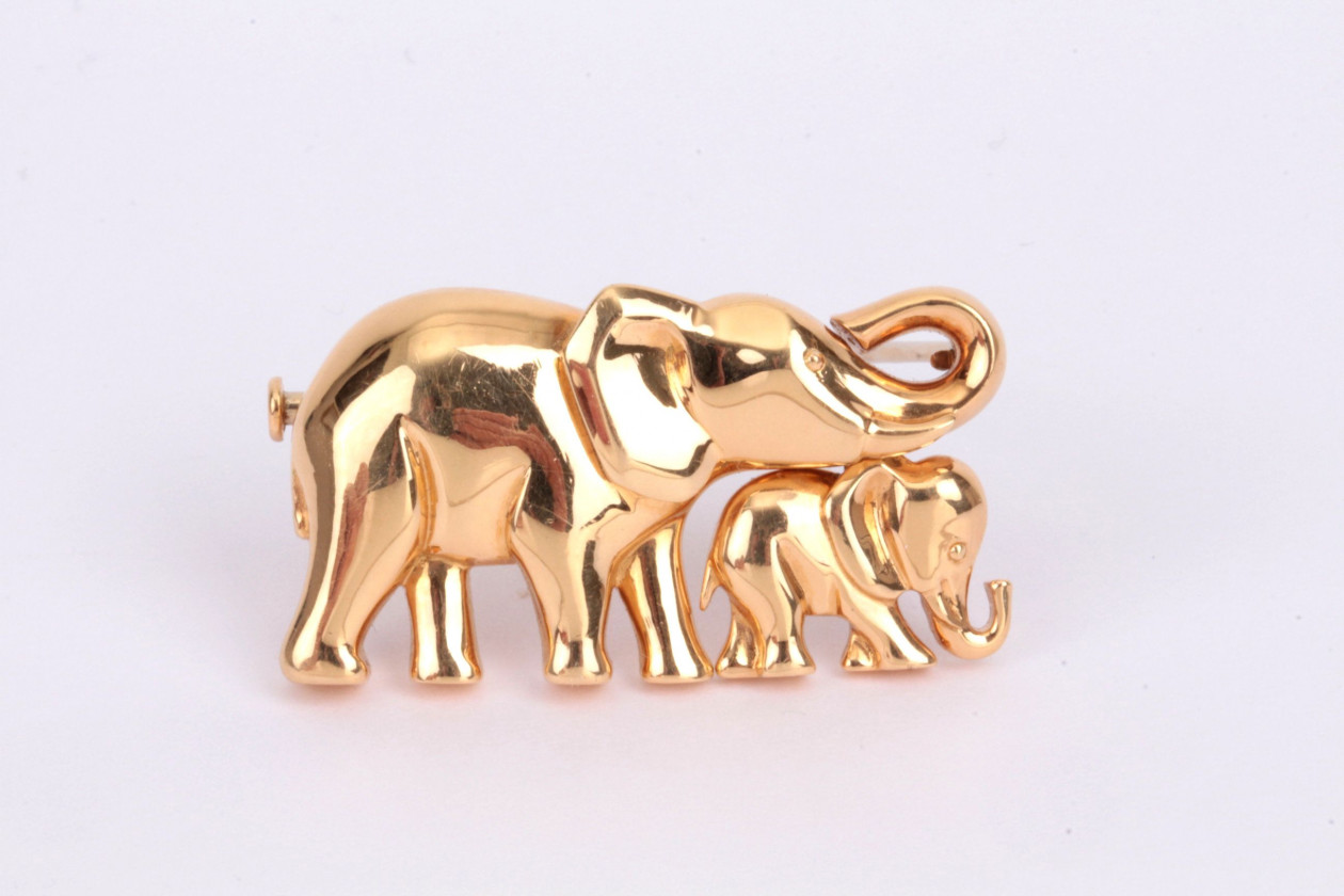 Broche en deux parties signées "CARTIER", titrées et portant chacune le même numéro. L'éléphanteau mobile, peut-être porté en pendentif, car fixé à sa mère par une bélière. Présence de trois poinçons "tête d'aigle" et de deux poinçons de joaillier de la Société G.A.B..