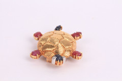 Clip monogrammé V.C.A. et numéroté. Les yeux sont des diamants taille 8/8 en serti clos sur tube en platine, la tête en saphir gravé, les pattes en rubis gravés. Présence de trois poinçons "tête d'aigle" et du poinçon du joaillier Perry et Fils.